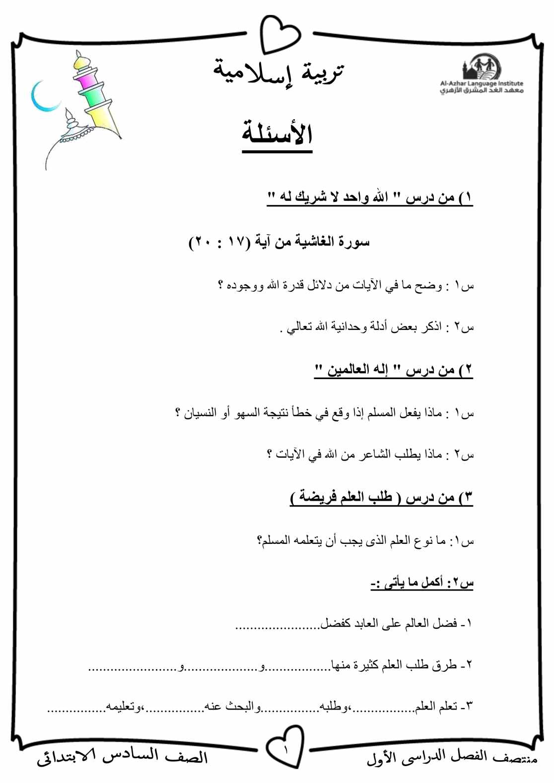 ملزمة مراجعة مجاب عنها فى التربية الدينية الاسلامية للصف السادس الابتدائى الترم الاول Exam Islamic Studies Math
