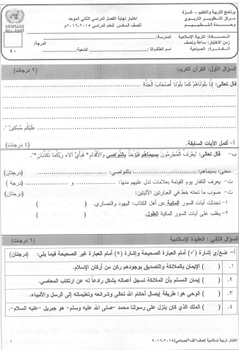 اختبار تربية اسلامية للصف السادس نهاية الفصل الثاني 2016 المكتبة الفلسطينية الشاملة