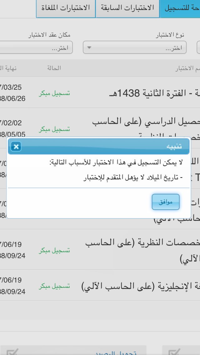 تاريخ الميلاد لا يؤهل المتقدم للإختبار. 18 سنة للحصول على رخصة خاصة. المتقدم الذي لا يوجد له تخصص في قياس هل يكتفي فقط بالاختبار العام الأسئلة المتكررة في المركز الوطني للقياس. ما هي اسباب ظهور رسالة المتقدم ضمن قائمة الممنوعين من التسجيل قياس سنعرض إليكم من خلال موقع جوابك سبب رسالة. لا يسمح حجز موعد لمن تقل أعمارهم عن.