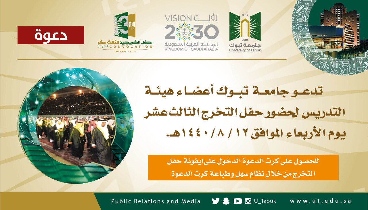 جامعة تبوك On Twitter دعوة يسر جامعة تبوك دعوةجميع أعضاء هئية التدريس لحضور حفل التخرج الثالث عشر وذلك يوم الأربعاء الموافق 1440 8 12ه ولطباعة كرت الدعوة من خلال أيقونة حفل التخرج من
